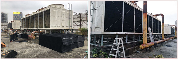 冷卻塔一般使用了4-8年的時(shí)間,冷卻塔的填料一般會(huì)結(jié)很多的污垢,有些填料使用幾年后,填料老化嚴(yán)重,導(dǎo)致很多冷卻塔填料變形,破碎,直接影響了冷卻塔散熱效果,這個(gè)時(shí)候,冷卻塔維修就是必不可少的了,因?yàn)槔鋮s塔填料一旦老化,就會(huì)造成進(jìn)風(fēng)阻礙,因?yàn)樘盍祥L時(shí)間使用,就算有做水處理,有做清洗,也很難清洗冷卻塔填料長時(shí)間使用留下的污垢,青苔,所以進(jìn)風(fēng)是受到很大的阻礙,冷卻塔填料是冷卻塔最核心的一部分,填料老化,直接導(dǎo)致冷卻塔效率差的原因之一,如果不更換,冷卻塔降溫效果差,導(dǎo)致空調(diào)主機(jī)常時(shí)間負(fù)荷工作,不但影響主機(jī)壽命,也大大影響能耗,導(dǎo)致耗電嚴(yán)重,嚴(yán)重的直接跳機(jī),無法正常使用,那么冷卻塔填料怎么更換呢,廣東康明節(jié)能空調(diào)有限公司就是專門做冷卻塔填料更換的廠家,公司承接深圳冷卻塔維修,冷卻塔改造已經(jīng)有16年的經(jīng)驗(yàn),冷卻塔填料更換的步奏為,拆下冷卻塔舊填料,清洗塔內(nèi)污垢,播水盆很多地方都是堵死了,必須清洗,有些需要重新開孔,保證布水均勻,清洗完冷卻塔后,重新裝上新冷卻塔填料,填料安裝必須每張蜂窩狀保持整潔,確保每一張通風(fēng)都沒有問題,冷卻塔填料更換改造工程施工步驟圖如下: